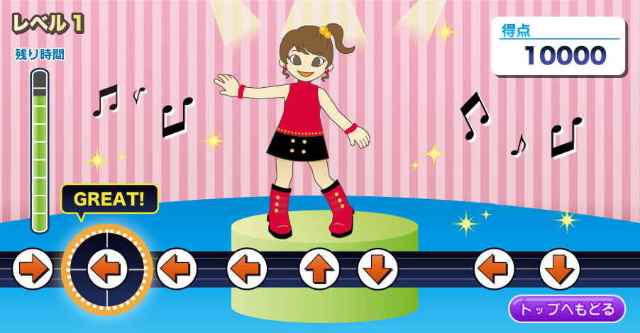 流れてくる矢印に合わせて上下左右キーを入力し、得点を獲得します。